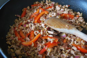 玉ねぎがしんなりするまで炒めたら、豚肉を加えて、パラパラになるように炒める。