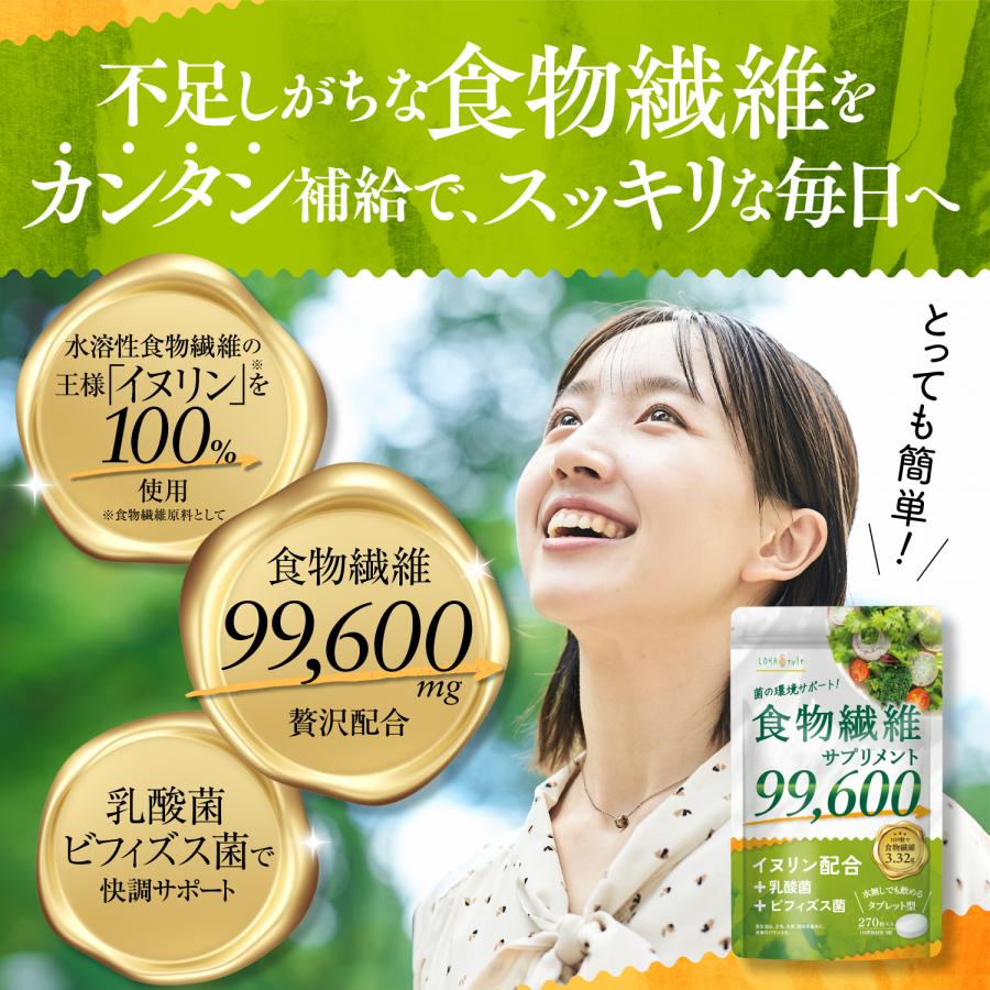 - 「水溶性食物繊維の王様」イヌリンを100%使用し、乳酸菌とビフィズス菌を配合した贅沢なサプリです。1日9粒で3,320mgもの食物繊維を手軽に補給でき、内側からスッキリ健康な毎日をサポート。外出先でも飲みやすい10mmのタブレット型で、噛んでも美味しく続けられます。