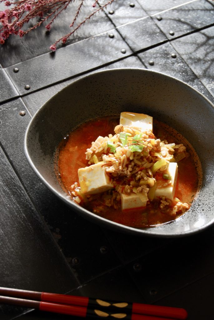 ②の合わせ調味料を加え、賽の目切りにした豆腐を加えて一煮立ちさせる。